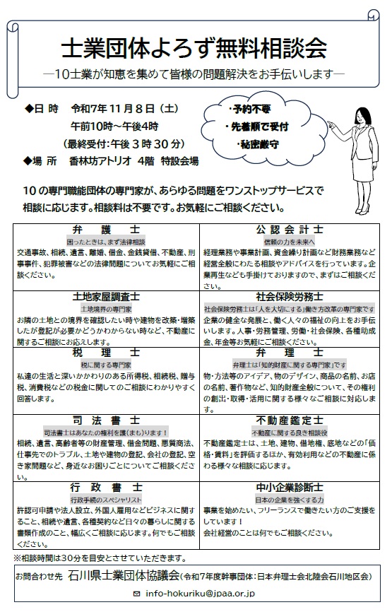 令和7年11月8日(土)、金沢市の香林坊アトリオにて、10士業団体による無料相談会が開催されます。